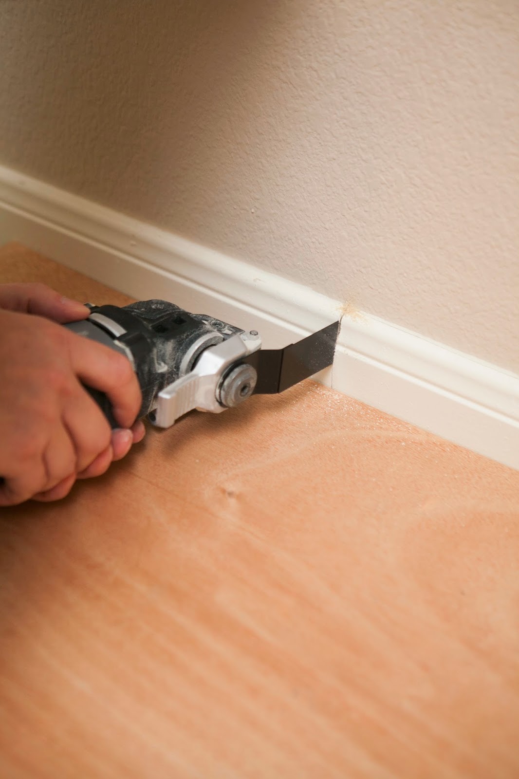 Pretty impressed myself...you can hardly tell it isn't one piece!! From here these bad boys were brought upstairs to be attached to the wall. We want to create the built-in look, so first we had to cut out a portion of the baseboard. First step, mark the desired placement of your dresser. Then, Jeremy used his Porter Cable oscillating multi-tool to cut the baseboard. We put a piece of spare wood down to protect the carpet, which ended up being un-necessary due to a future decision made to remove the carpet.